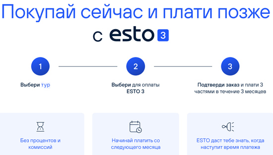 ESTO - 3 месяца без процентов!Купи сейчас, оплати позже – 3 частями, без процентов и дополнительных расходов!ESTO 3 — новый метод оплаты, который позволяет вам комфортно и быстро оплачивать свои покупки, разбивая сумму на три равных части, без дополнительных расходов!
